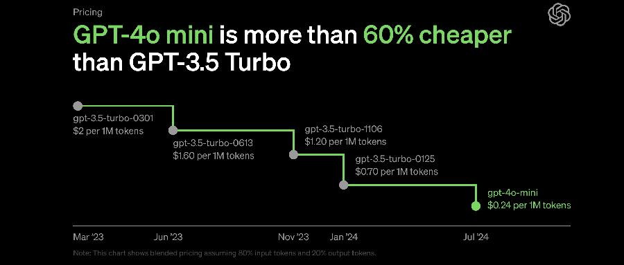 根据OpenAI公告,GPT-4o mini对比2022年功能相对初级的GPT-3的text-davinci-003模型,tokens成本已锐减99%。
