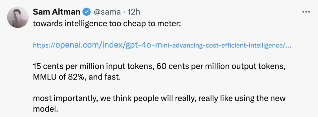 OpenAI CEO Sam Altman称,GPT-4o mini“走向廉价到无法计量的智能”。