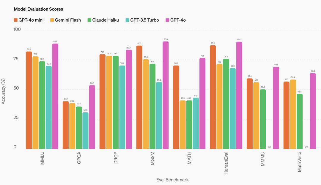 在多个全球权威基准测试中,GPT-4o mini成绩超越了自家的GPT-3.5 Turbo以及一众小模型。