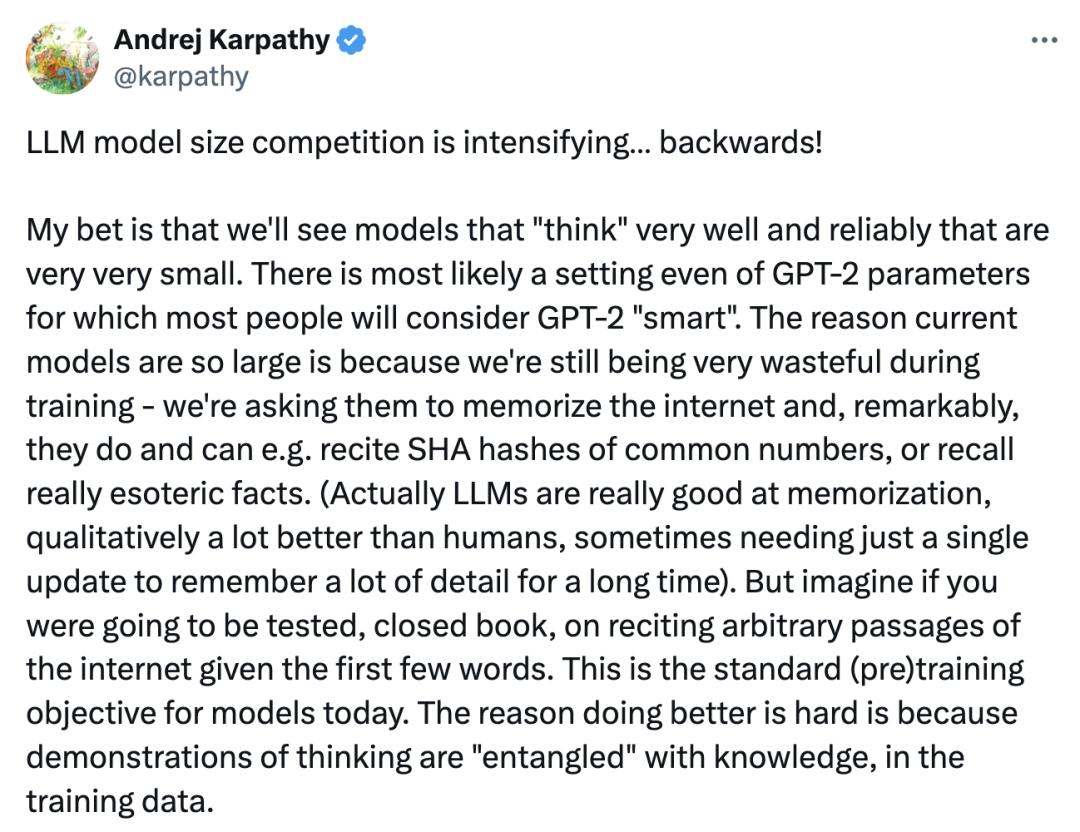 GPT-4o mini昨夜刚刚发布,AI大牛Andrej Karpathy在社交平台X上称:“大语言模型的尺寸竞争正在加剧……倒退!我敢打赌,我们会看到非常小的模型,甚至是GPT-2参数级别的模型,已经非常擅长‘思考’”且可靠。”