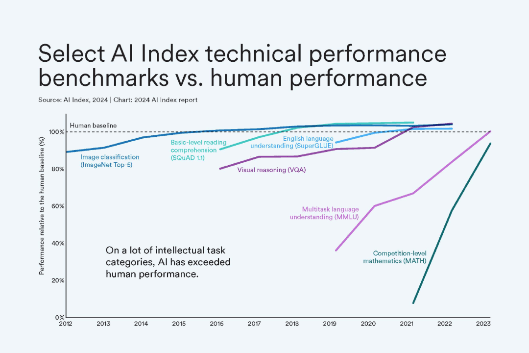 AI在图像分类、视觉推理和英语理解等任务上已经超过了人类的表现,这凸显AI在处理大数据和识别模式方面的显著优势。然而,AI在更复杂的任务上,比如竞赛数学、视觉常识推理和规划等方面,仍然落后于人类。这揭示AI在需要深层次理解和创造性思维的领域具有一定的局限性。