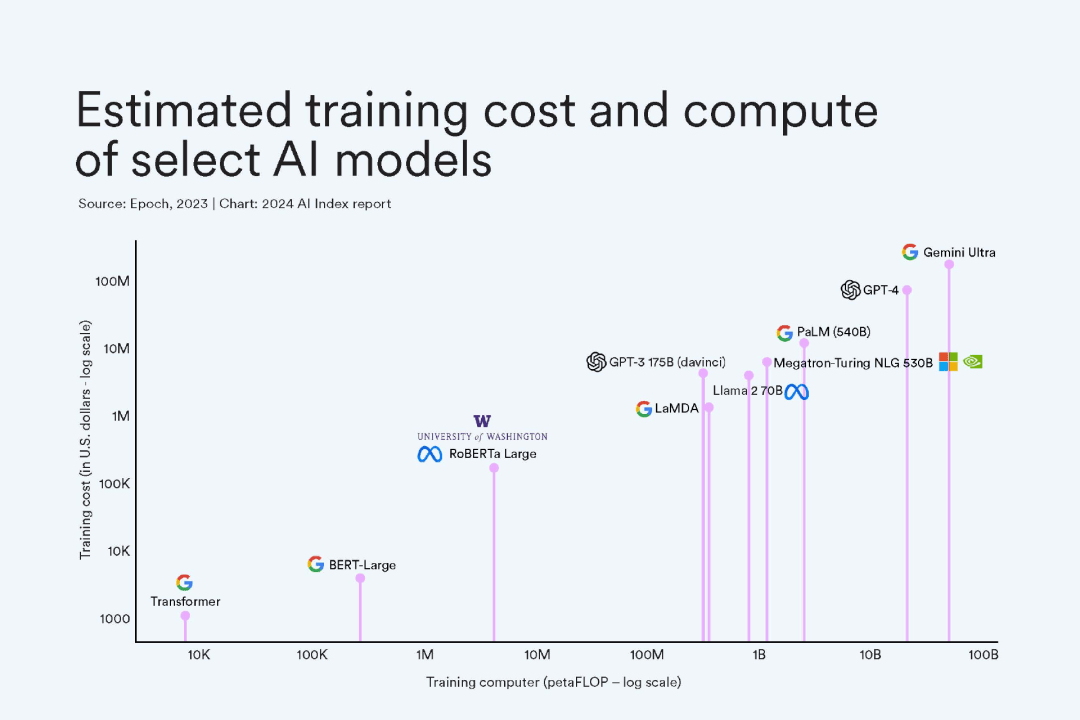 AI模型的训练成本已经达到了历史新高。例如,OpenAI的GPT-4模型训练成本预计为7800万美元,而谷歌的Gemini Ultra模型更是高达1.91亿美元。这种成本的上升,可能会导致资源过度集中在少数大型企业中,进而影响到AI技术的多样性和普及性。