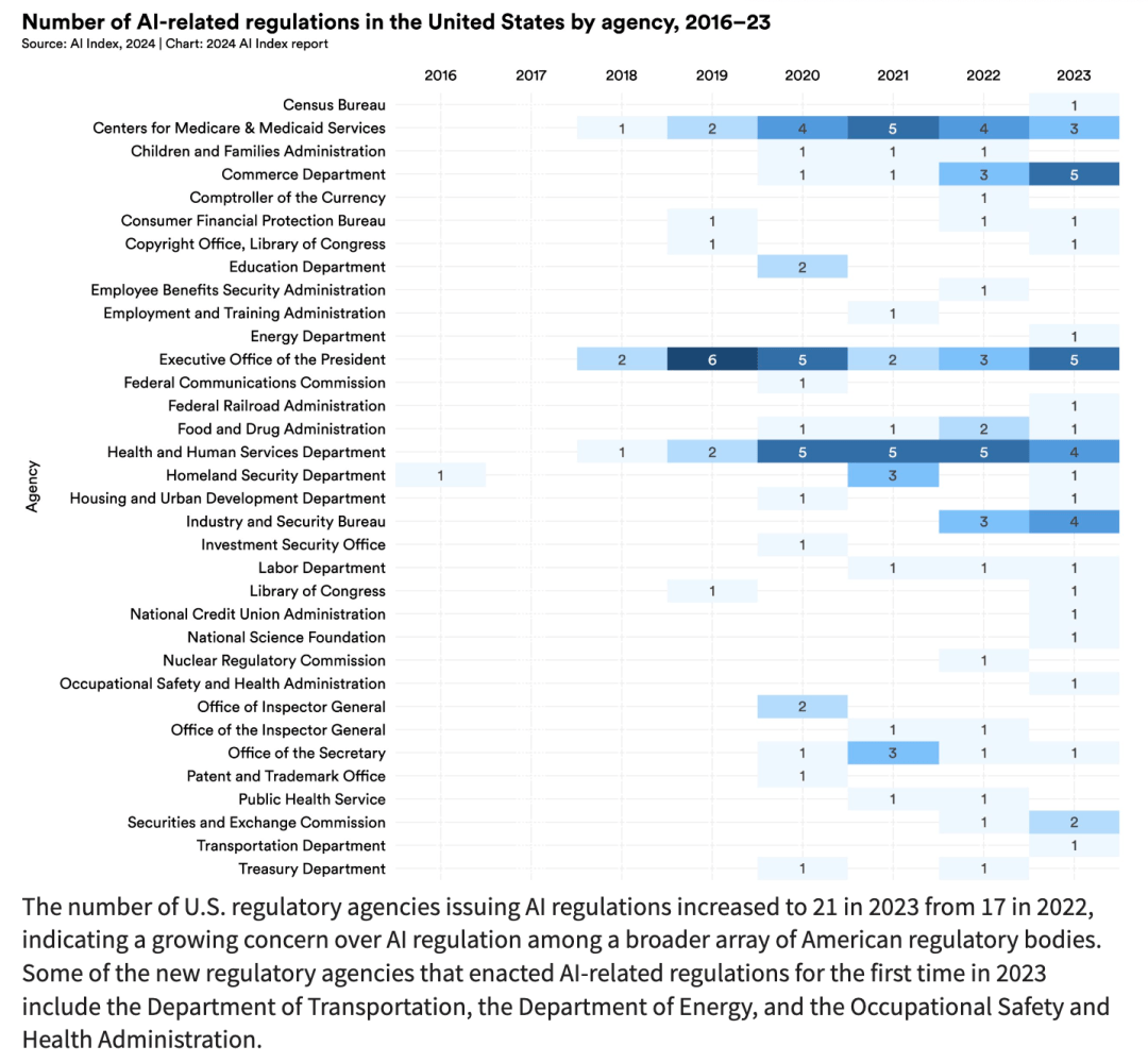 美国AI相关法规的数量在过去一年显著增加,中国也出台一系列AI相关的法律、法规。这一趋势反映了各国政府对于规范AI发展、保护公众利益的重视和行动。