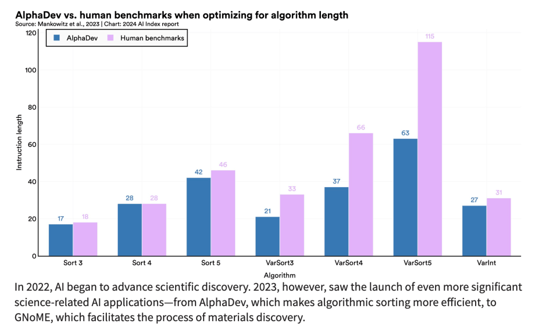 自2022年以来,AI开始在科学发现领域发挥重要作用。到了2023年,AI在科学领域的应用变得更加广泛和深入,并取得了一系列突破性的成果,如提高算法排序效率的AlphaDev和促进材料发现的GNoME等。