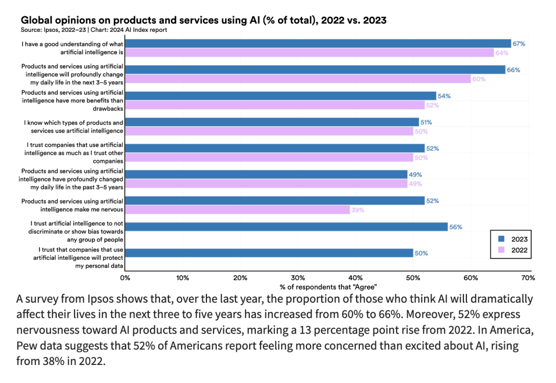 根据市场研究公司Ipsos的调查,在过去一年中,认为AI将在未来3-5年内极大影响生活的人的比例从60%上升到了66%。同时,对AI产品和服务表示担忧的比例上升了13个百分点,达到了52%。在美国,Pew的数据显示,对AI感到担忧的人超过了感到兴奋的人,比例从2022年的38%上升到了52%。这些数据表明,全球公众对AI的潜在影响有了更深刻的认识,但同时也伴随着担忧和不安。