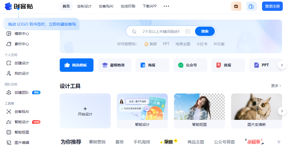 - AI智能设计:AI设计工具助力内容生产效率革命式提升,包括图片修复、智能改图、智能抠图、AI商品图和AI文案等。