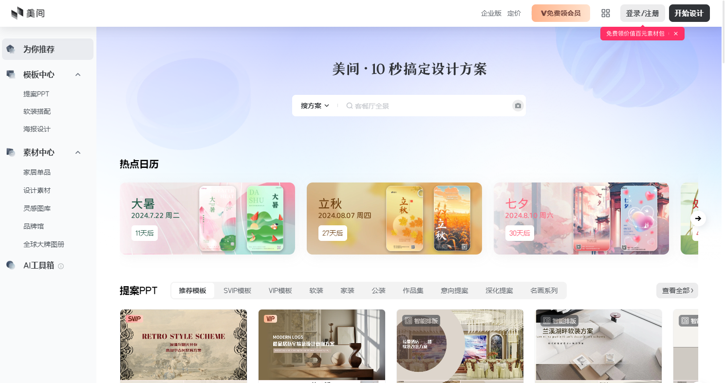 美间AI是由酷家乐公司推出的一种AI创意内容云设计工具,专为平面设计创作者打造,提供海量方案模板和快速设计工具,以实现流畅、高效、美观的创作体验 113。它主要服务于软装设计师,通过提供丰富的设计素材和简单易用的编辑功能,帮助设计师快速完成软装搭配创作